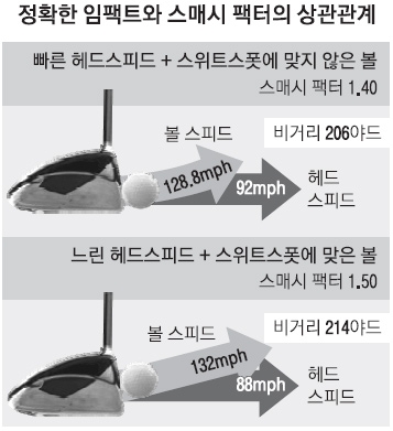 클럽헤드의 스윗스팟에 맞지 않고 힘전달이 덜한 부위에 맞으면 스메싱팩터가 낮아집니다. 따라서 볼스피드를 높여 볼의 비거리를 늘리고 싶다면 헤드스피드를 높임과 동시에 헤드와 공을 정확하게 맞춰야 합니다.