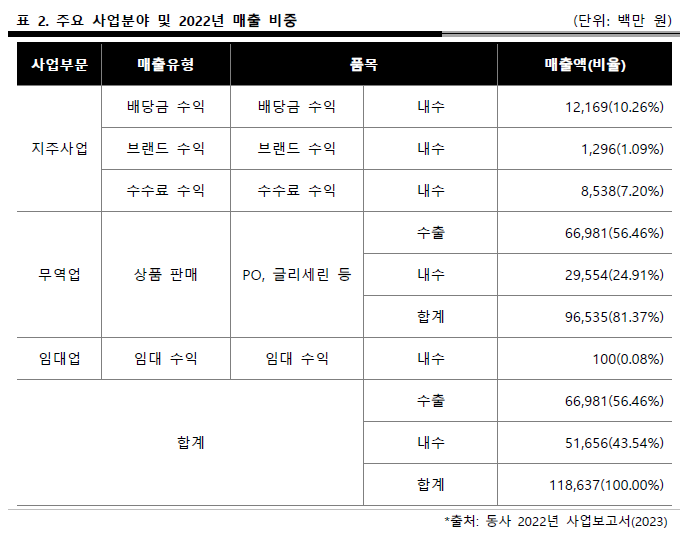 자회사들에게서 수수료, 브랜드 수익, 배당금 등의 수익을 얻고 있습니다. 또한, 자회사와 다른 거래처들로부터 상품 판매 및 임대료 수익도 발생하고 있습니다. 이 회사의 자회사들은 유기화학 및 화공약품 제조와 판매 등, 폴리프로필렌글리콜(PPG)과 같은 물질을 만들고 판매하는 분야를 전문으로 하고 있습니다. 또한, 자동차 부품 제조 및 판매와 사무실 임대 등 부동산 임대도 중요한 수익원입니다.