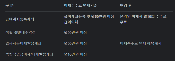 2.급여 이체가 50만원 이상 발생한 경우 (급여 계좌 등록은 필수사항입니다), 온라인 이체는 익월에면제됩니다 (익월 초일 오전 7시 이후에 적용), 또한 온라인 이체 시 월 10회까지 수수료가 면제됩니다.