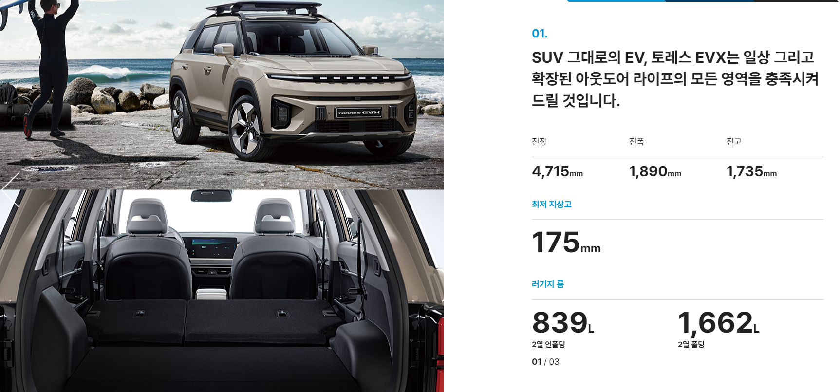 '토레스 EVX'는 KG모빌리티의 인기 중형 SUV 모델 '토레스'의 플랫폼을 기반으로 하여, 주로 오프로드와 레저 활동에 적합한 전기 자동차로 개발된 모델입니다. 이 차량은 이미 3월에 네이밍이 확정되고 서울 모빌리티쇼에서 공개되었으며, 사전 계약도 진행되었습니다.