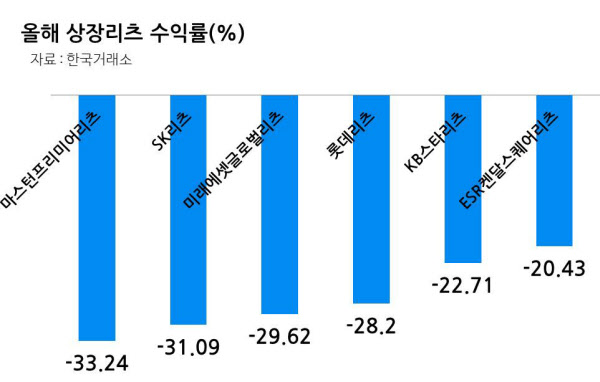 국내 10개의 상장 리츠로 구성된 'KRX 리츠 TOP10' 지수가 올해 들어 14.48% 하락했습니다. 주요 리츠 종목들, 특히 해외 부동산 자산을 가진 리츠들은 상당한 손실을 겪고 있습니다.