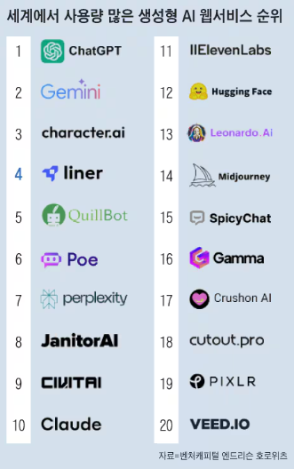 그 외에도 다양한 AI 플랫폼이 순위에 올랐습니다.