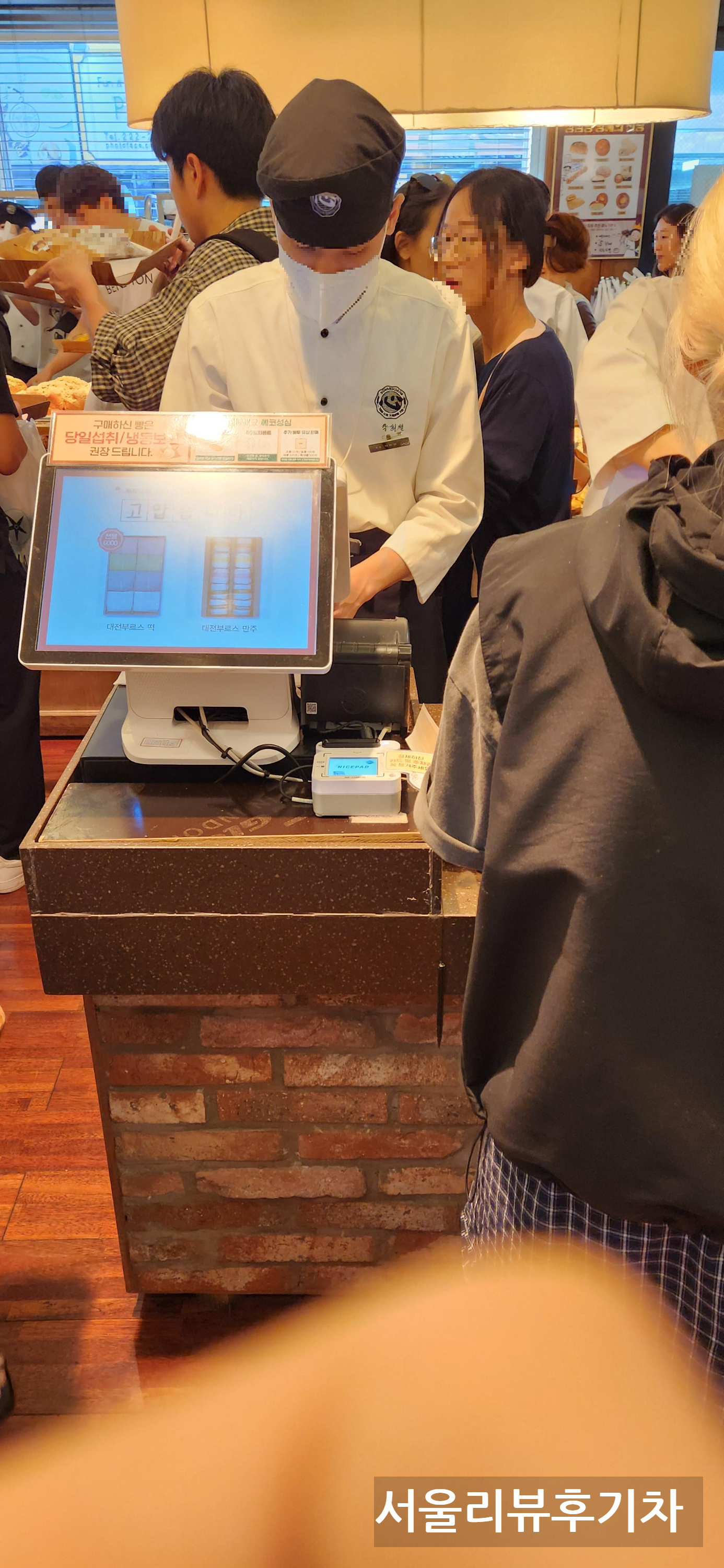 계산대는 여러개 준비되어 있어 의외로 빠릅니다. 빵 고르는데 사람이 많아 시간이 걸리지 계산은 속행이에요.