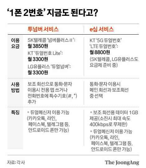 듀얼심 서비스 중 SKT의 경우, 이를 마이투넘버 서비스라고 명명하였으며, 기존 요금제를 사용하던 사람이 E심 전화번호를 하나 더 받아서 사용할 수 있었습니다. 요금은 8,800원이었어요.