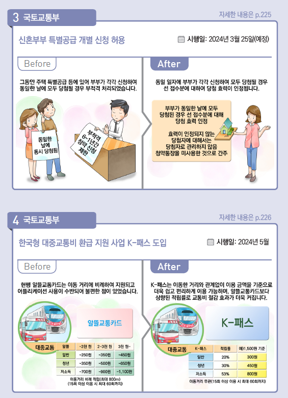 기획재정부는 2024년부터 시행되는 새로운 제도와 법규사항을 알기 쉽게 정리한 "2024년부터 이렇게 달라집니다" 책자를 발간했어요. 정부에서 새롭게 추진하는 다양한 정책은 우리의 삶에 도움