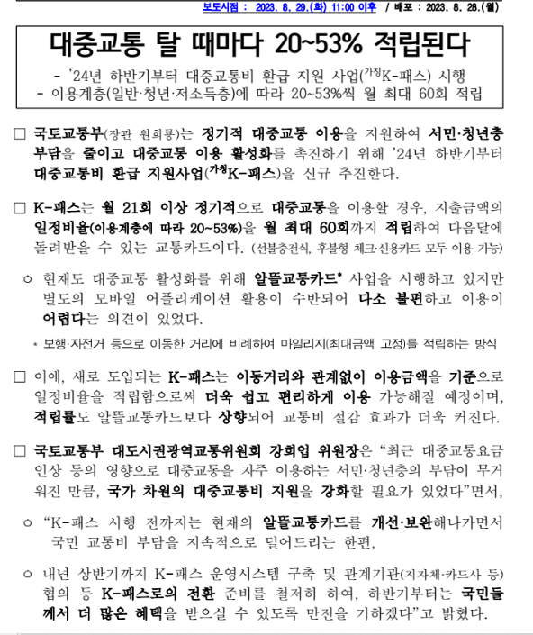2024년 5월부터는 K패스 카드가 나올 거에요. 이 카드를 사용하면 매달 교통비의 일부를 돌려받을 수 있어요.