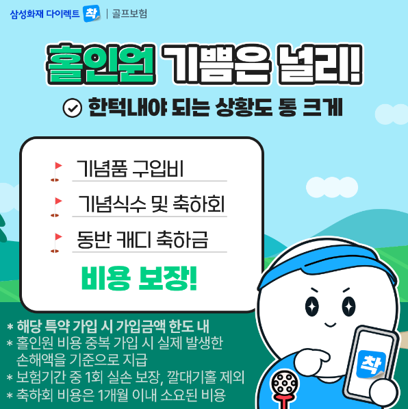 증정용 기념품 구입비용, 축하회 비용, 골프장에 대한 기념식수 비용, 동반캐디에 대한 축하금 등 가입금액 한도 내에서 보상 (1회/보험기간 중)