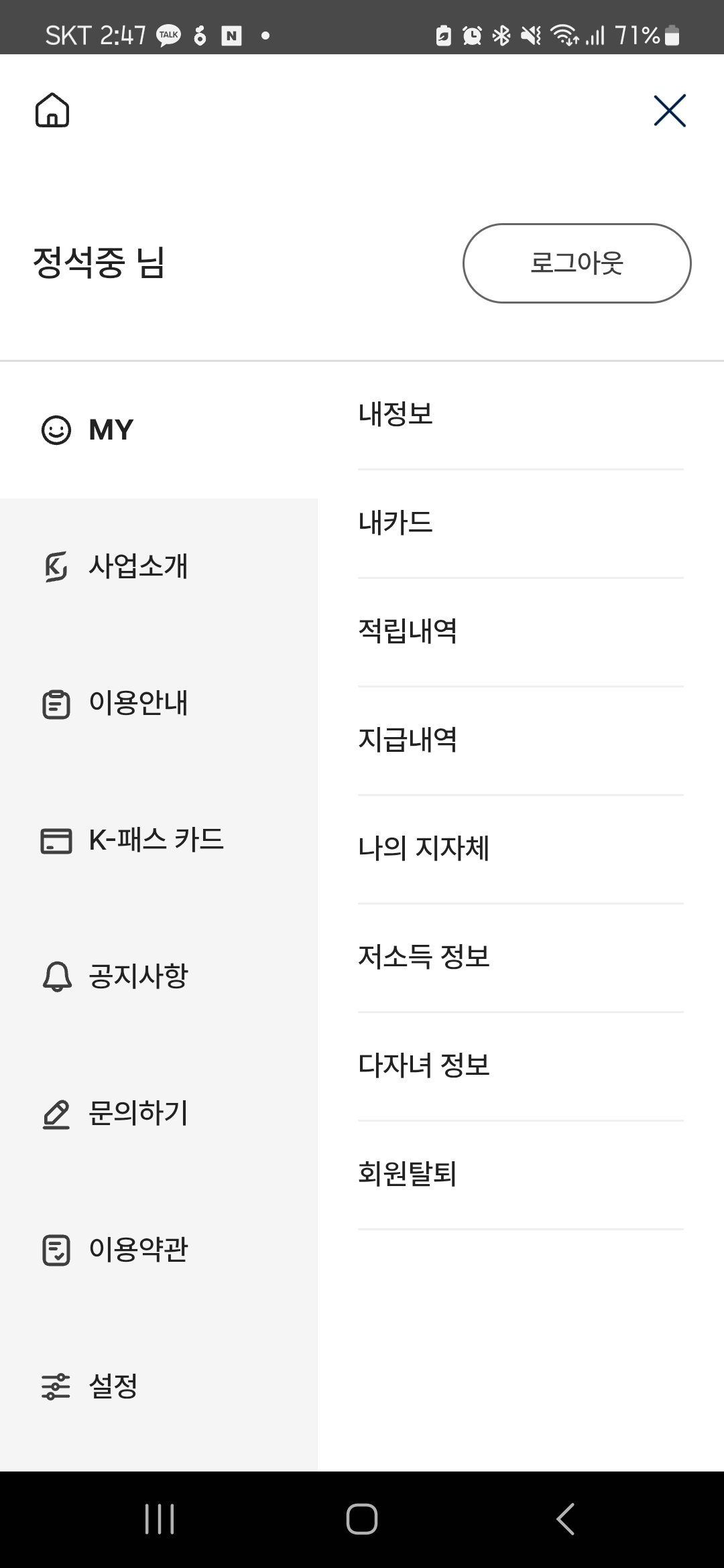 - 적립내역/지급내역: 교통비 지원 내역을 확인할 수 있는 메뉴입니다.