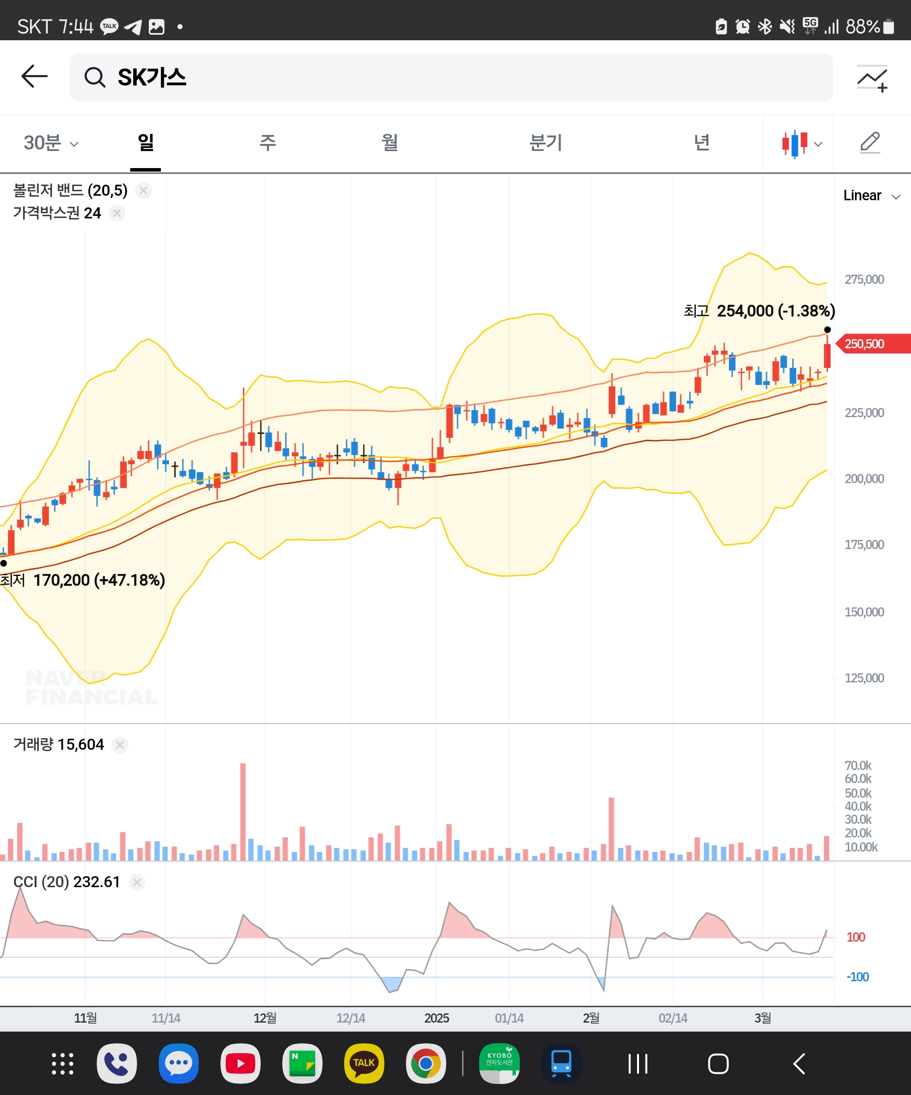 SK가스의 최근 주가 움직임을 살펴보면 52주 최고가는 254000원 52주 최저가는 148300원으로 기록되었습니다. 현재 주가는 연중 최고점 근처에 위치해 있어 강한 상승 흐름을 이어가는 모습입니다.