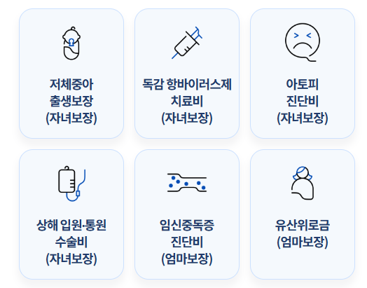 - 선천이상 및 중증 아토피 진단비 : 각각 최대 10만 원~20만 원 지원