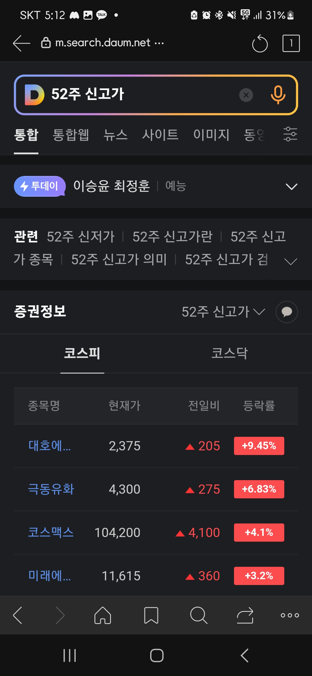 다음앱에서 '52주 신고가'를 검색하면 종목이 나옵니다.