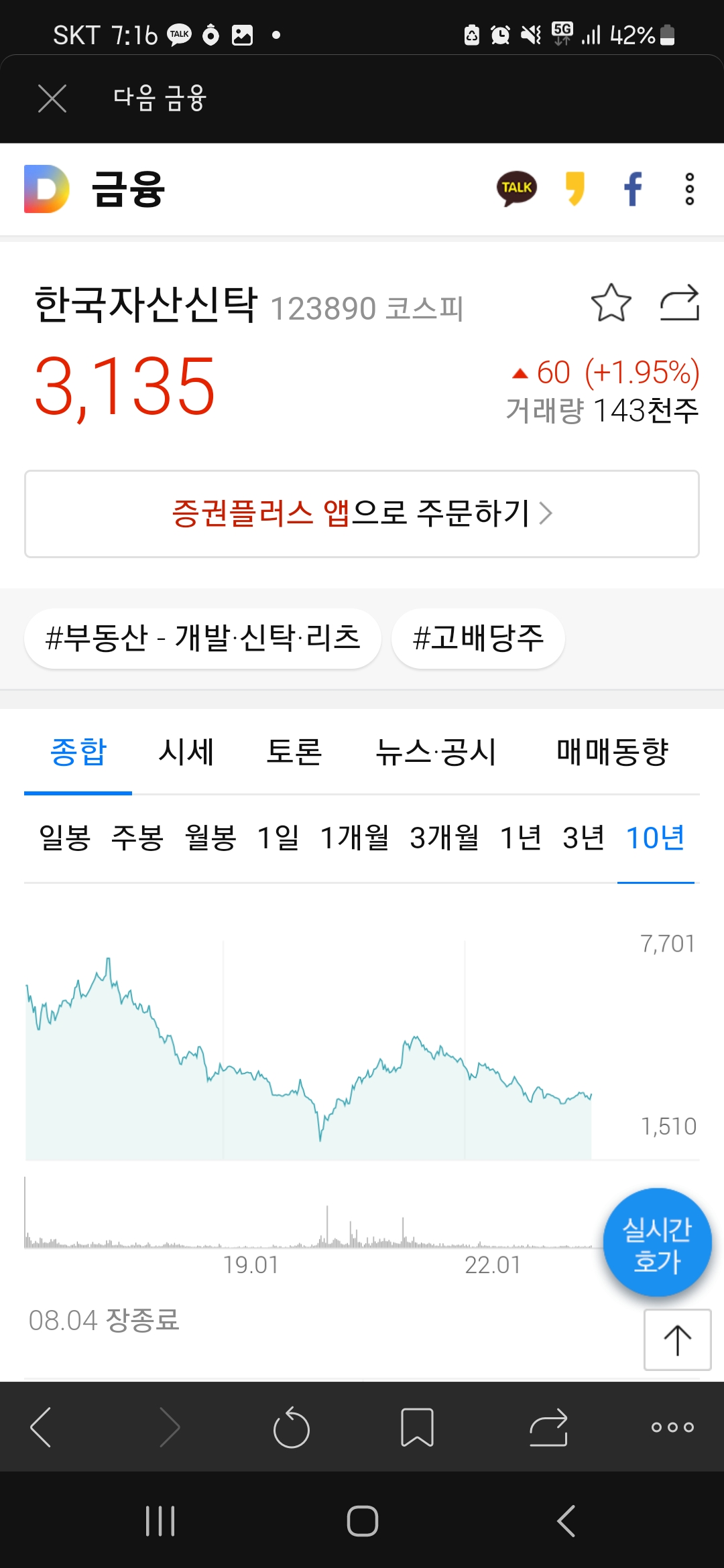 다음앱에서 '배당주'를 검색하면 배당수익율이 높은 종목을 순서대로 보여 줍니다. 아래는 고배당주 중 하나인 '한국자산신탁'의 정보입니다.