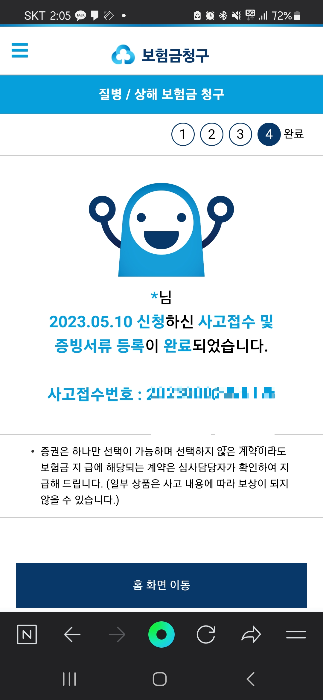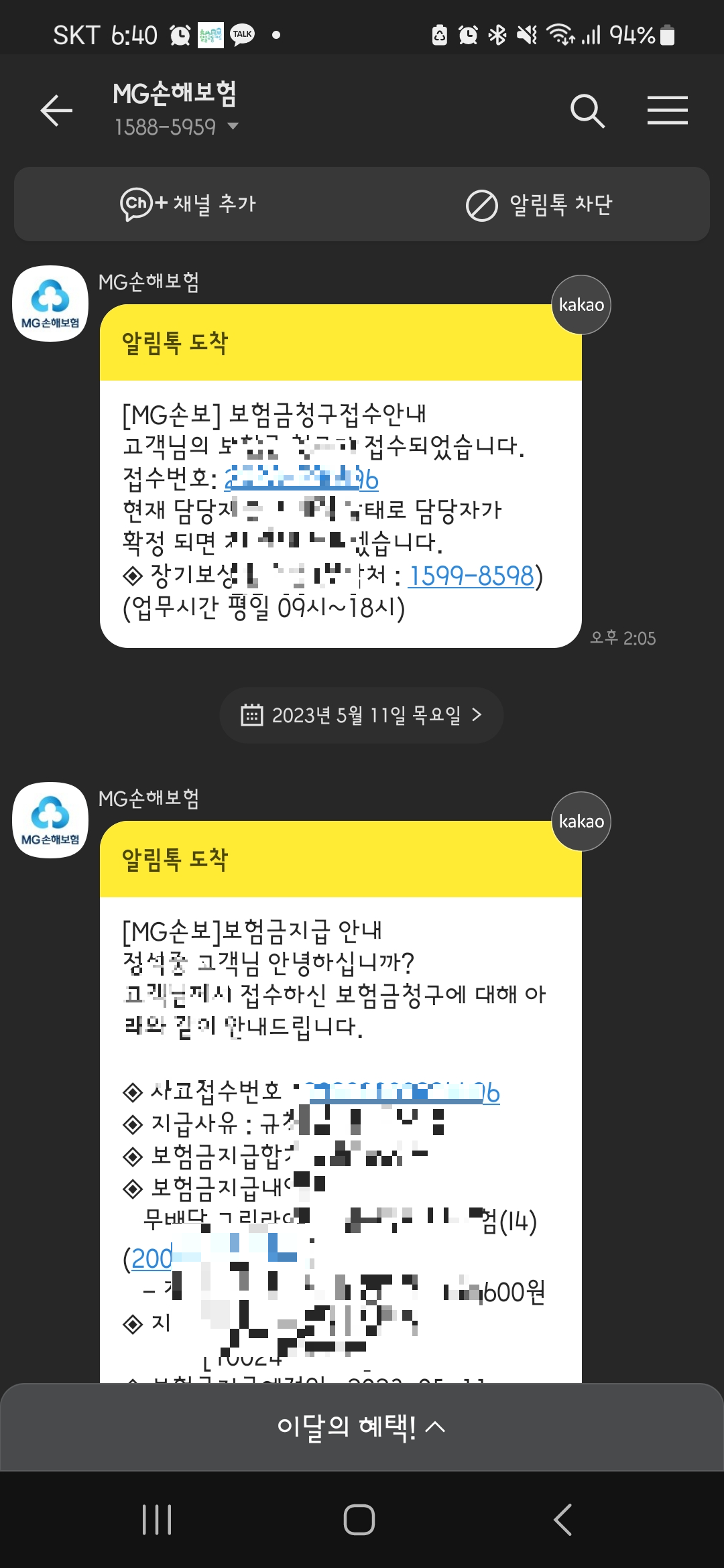 입력을 완료하면 카카오톡으로 접수되었다는 톡이 옵니다. 보험금 지급은 신청서 접수일 기준 1~2일 이후 지급되며 이 때에도 알림톡이 옵니다.