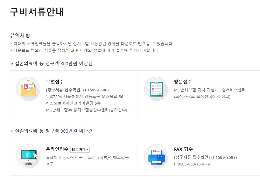 아래 MG 손보 안내에는 여러 서류들이 있는데 이 정도로 서류제출해도 보험금이 지급됩니다. 보험금신청서의 경우 홈페이지 공인인증 후 보험금청구메뉴에 보면 청구내용을 기입하고 개인정보를 기입하는데 그 내용이 신청서입니다.
